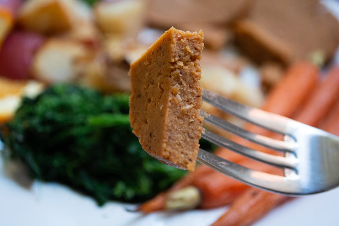 INGREDIENTS: wheat gluten, navy beans, nutritional yeast, canola oil, pure maple syrup, pineapple juice, tomato paste, liquid aminos, Dijon Mustard (vinegar, mustard seed, salt, Chardonnay wine, citric acid, tartaric acid, spices, turmeric), liquid smoke, salt, monosodium glutamate, spices, apple cider vinegar